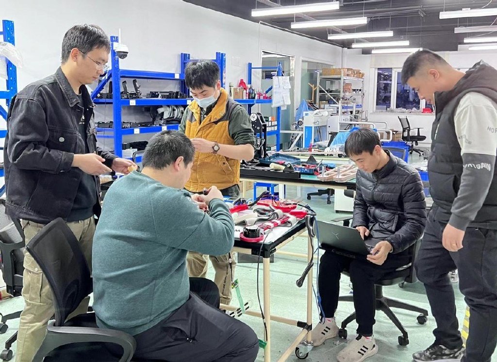 大艾团队在外骨骼机器人的腿部部件、关节电机的设计、选型上花费很大的精力。经过多次反复核算与实验,前后经过数十次大方案变更,近百次小细节调整,最终才设计出满足要求的内部架构,继而实现功能与轻量化的完美均衡。而接下来则需要进行高负荷的样机装配及测试工作。